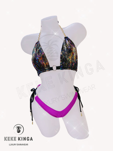 - Holographic snake skin print fabric paired with shimmery black spandex ties