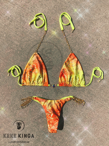 - Holographic abstract print fabric front paired with glitter chartreuse spandex back